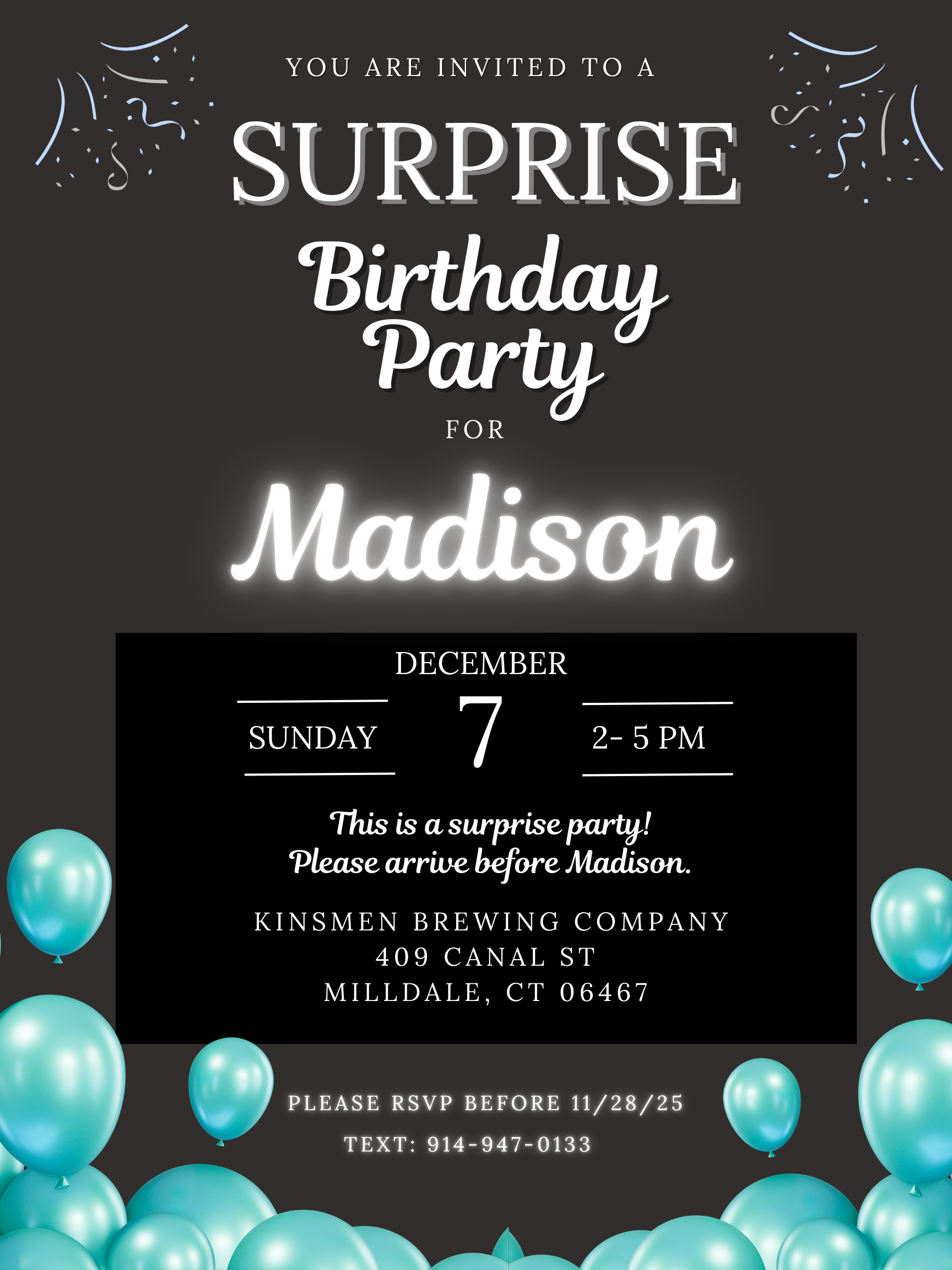 Designed a custom digital invitation for a surprise birthday celebration. The design uses typography, color contrast, and festive visual elements to create an engaging event announcement while clearly presenting important details for guests.